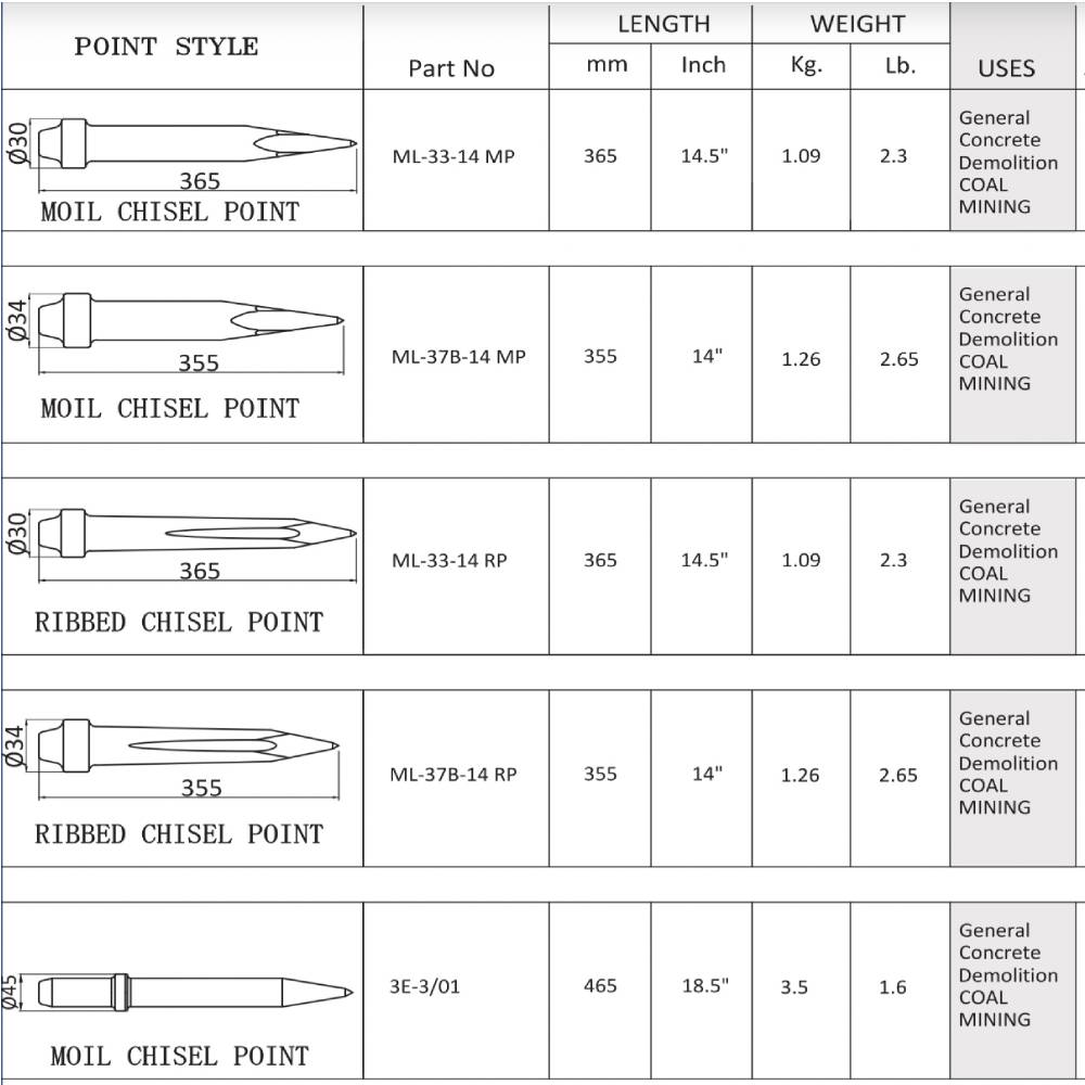 Moil Chisel Point (355) ML-37B-14 MP 355 14” 1.26 2.65 General concrete demolition Coal Mining